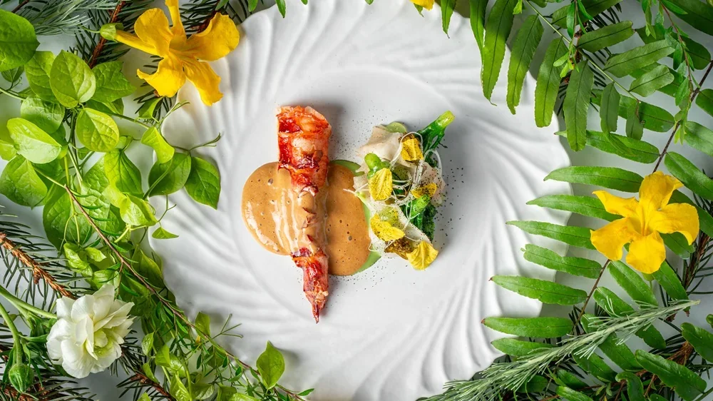 - The Signature Menu (THB 5,800++): The most complete expression of Duet’s philosophy. It features emblematic creations like the Alaskan King Crab with Shadi Schrenki caviar and kaffir lime, and the Brittany Blue Lobster, uniquely paired with spruce needles that evoke notes of lime zest and soft resin.